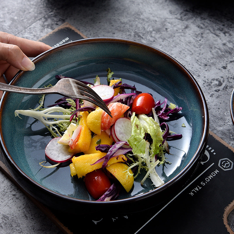 The tableware's edges feature a dark embellishment, creating a striking contrast with the main blue-green glaze. This not only adds a sense of depth visually but also creates a retro feel. The dark edges are meticulously polished for a smooth, delicate finish that won't scratch your mouth and also enhances the tableware's durability.